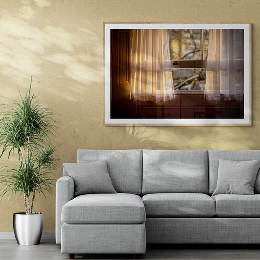 From A Window: Golden Light on Lace Curtains in a London Hotel Room