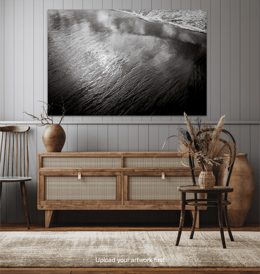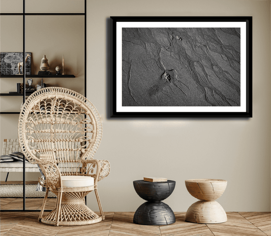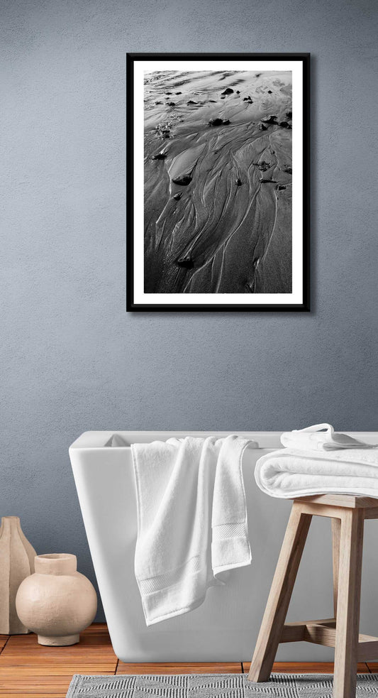 Traces #1 – Sand Sculpted by Water Showing Footprints– Black & White Nature Photography